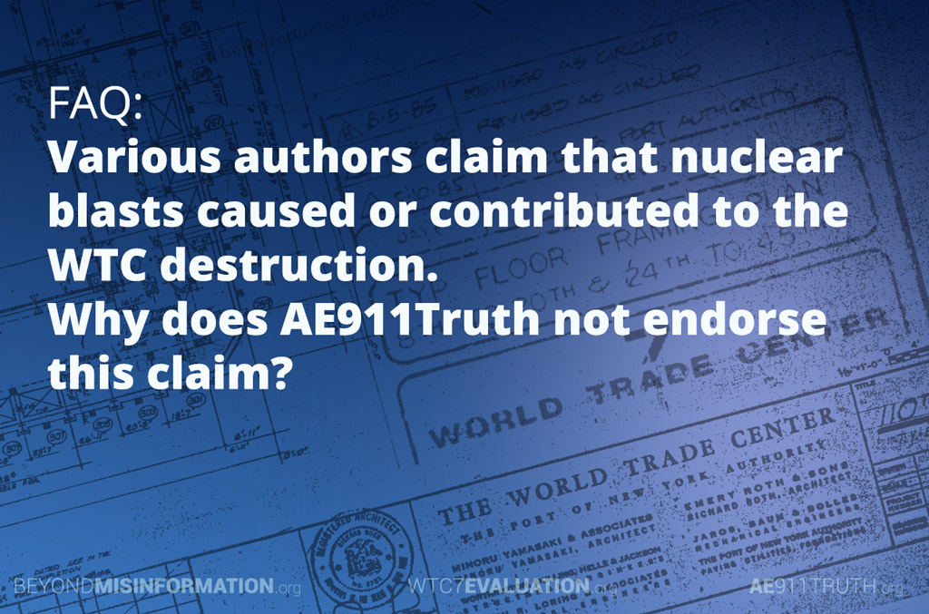 Several authors promote the claim that nuclear blasts destroyed the World Trade Center (WTC) on September 11, 2001. Suggested scenarios are, for example, that fission bombs, fusion-boosted fission bombs, neutron bombs, thermonuclear bombs, pure fusion deuterium-tritium bombs, or exploding nuclear reactors, caused its destruction. We have been asked why we do not endorse any of these claims.