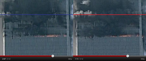 Left: North Tower (WTC 1) before collapse; Right: North Tower (WTC 1) at start of collapse. Blue line denotes 98th floor. Red line denotes approximate area of collapse initiation. Stills taken from video of North Tower collapse.