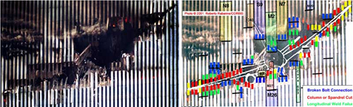 Left: North Tower (WTC 1) north face; Right: Damage relative to the shape and size of a Boeing 767. Note that only the tip of the starboard (right) wing cut through the 98th floor.