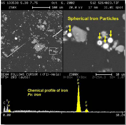 Substantial quantities of once-molten iron spheres, up to 150 times the background level of iron in dust from other buildings in the area, were found and documented by the US Geological Survey (USGS) and The RJ Lee Group. RJ Lee found the microspheres in amounts up to 6% inside the skyscraper across the street from WTC 2. Other scientists estimate a total of 10 tons to 100 tons of microspheres altogether throughout Lower Manhattan. These spheres were so plentiful that RJ Lee used them as a "signature component" of the WTC Dust, and the EPA discussed their use as signature markers. RJ Lee notes that the microspheres were "created during the event," that is, they were not created by welding operations during the cleanup of Ground Zero. The once-molten state of these microspheres indicates that they were created by temperatures hot enough to melt iron. Office fires and jet fuel fires, which do not produce such high temperatures, could not possibly have produced them.