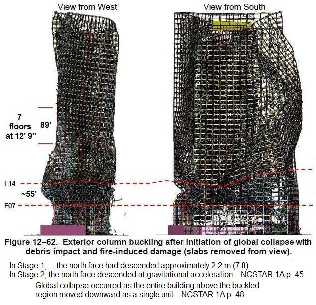 The above computer animation is the one “with debris damage” (caused by framing sections from WTC 1). Note that the other NIST computer simulation (not shown here), which was performed “without debris damage” is irrelevant, since NIST documented that debris damage did occur.)NIST’s Final Report on the collapse of WTC 7 (NCSTAR 1A, p. 45) states that gravitational acceleration (free fall) of the main roofline occurred. It began when the point NIST was using[1] as its marker on the video had descended about 7 feet*. In Figure 12-62 (NCSTAR 1-9 Vol.2 p. 588) the roofline has descended about 10m /33 feet (NCSTAR 1-9A, p. 77) and the columns are still buckling in an irregular manner. Buckling columns provide resistance and would obviously prevent the building from collapsing at free-fall acceleration. The NIST computer model is clearly not simulating free-fall acceleration.