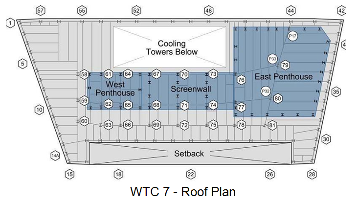 “The results of this scenario were consistent with observations except that the screening wall on the roof fell downward before the west penthouse.” NCSTAR 1-9, Vol. 2, p. 612