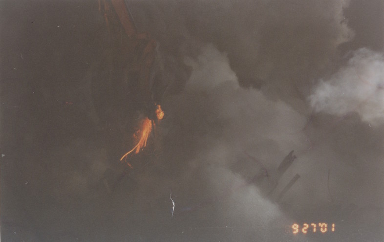 This photograph, taken by Frank Silecchia on September 27, 2001, shows a piece of metal being dug up that is salmon-to-yellow color, indicating temperatures from 845°C (1,550°F) to 1,040°C (1,900°F).