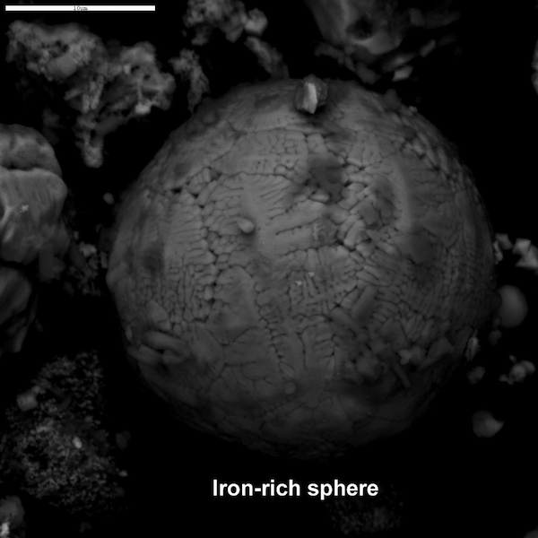 A scanning electron microscopy image with EDS of an “iron-rich sphere” provided by USGS.