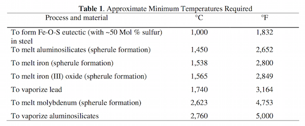 In addition to observing spherules of iron and silicates, their study discussed the presence of molybdenum spherules documented by the USGS study but not included in its report. (This additional data from the USGS study was obtained through a FOIA request.) Molybdenum is known for its extremely high melting point of 2,623°C (4,754°F).