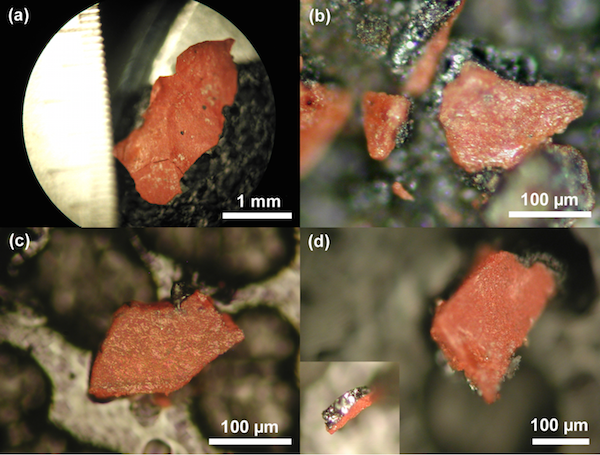 Photomicrographs of red-gray chips from each of the four WTC dust samples. The inset in (d) shows the gray layer of the chips.