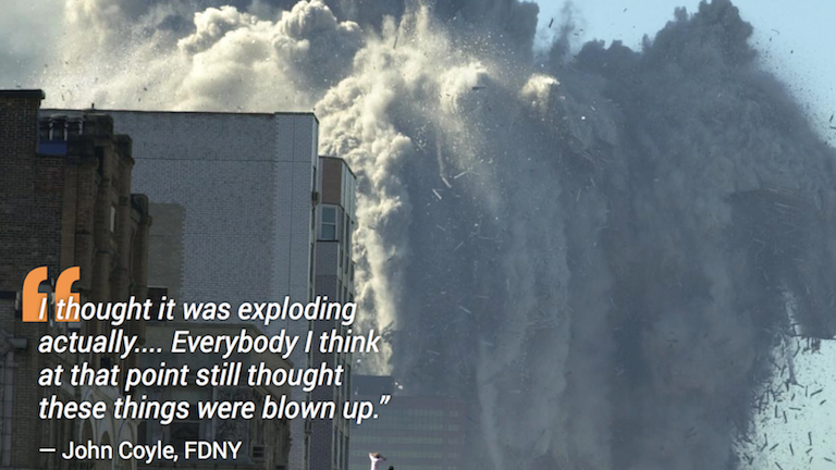 “We just made our turn to go in towards the lobby of tower two. For whatever reason, I just happened to look up and saw the whole thing coming down, pancaking down, and the explosion, blowing out about halfway up.” [p. 6]