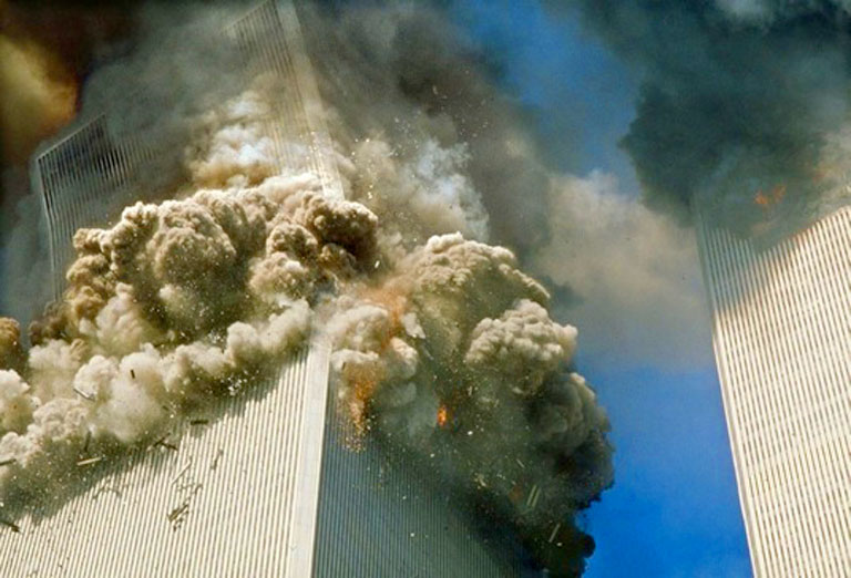 Figure 1. The South Tower's top tilted 22 degrees to the left, then disintegrated straight down into the rubble cloud.