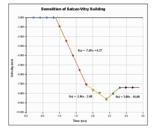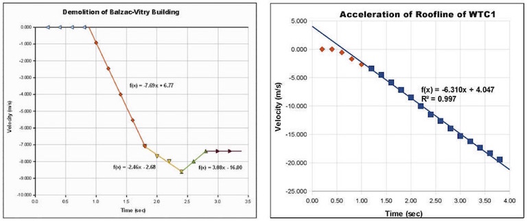 In all known measurements of these “Verinage” demolitions, the descent of the roofline shows definitive proof of deceleration of the upper building sections as they impact the lower structure, as seen in the velocity graph of the Balzac-Vitry building demolition below.