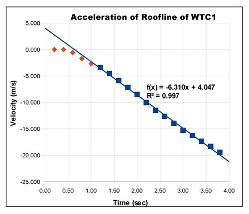 There is obviously no deceleration in the fall of the upper section of WTC 1. A “natural” collapse (without the use of explosives) could not have occurred without it. Therefore, this verified scientific data proves that explosives must have been employed to remove the structural columns – and thus to bring down the World Trade Center North Tower.