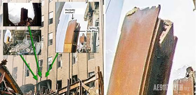 "Another way is using these thermitic lances, which use [unintelligible] inside this long tube, and they pipe oxygen through it, and that creates a very, very hot flame coming out the other side—basically almost like a plasma coming out the other side. And that will pretty much eat through anything. And you can see the thing being used here. The cut on the right cut through one of the core columns. So there would have been a huge amount of iron microspheres that were on site from the clean-up. Of course this wouldn't affect dust that was in distant locations, but you have to ask, Where was the sample taken? Was it an area in which clean-up had been done?"
