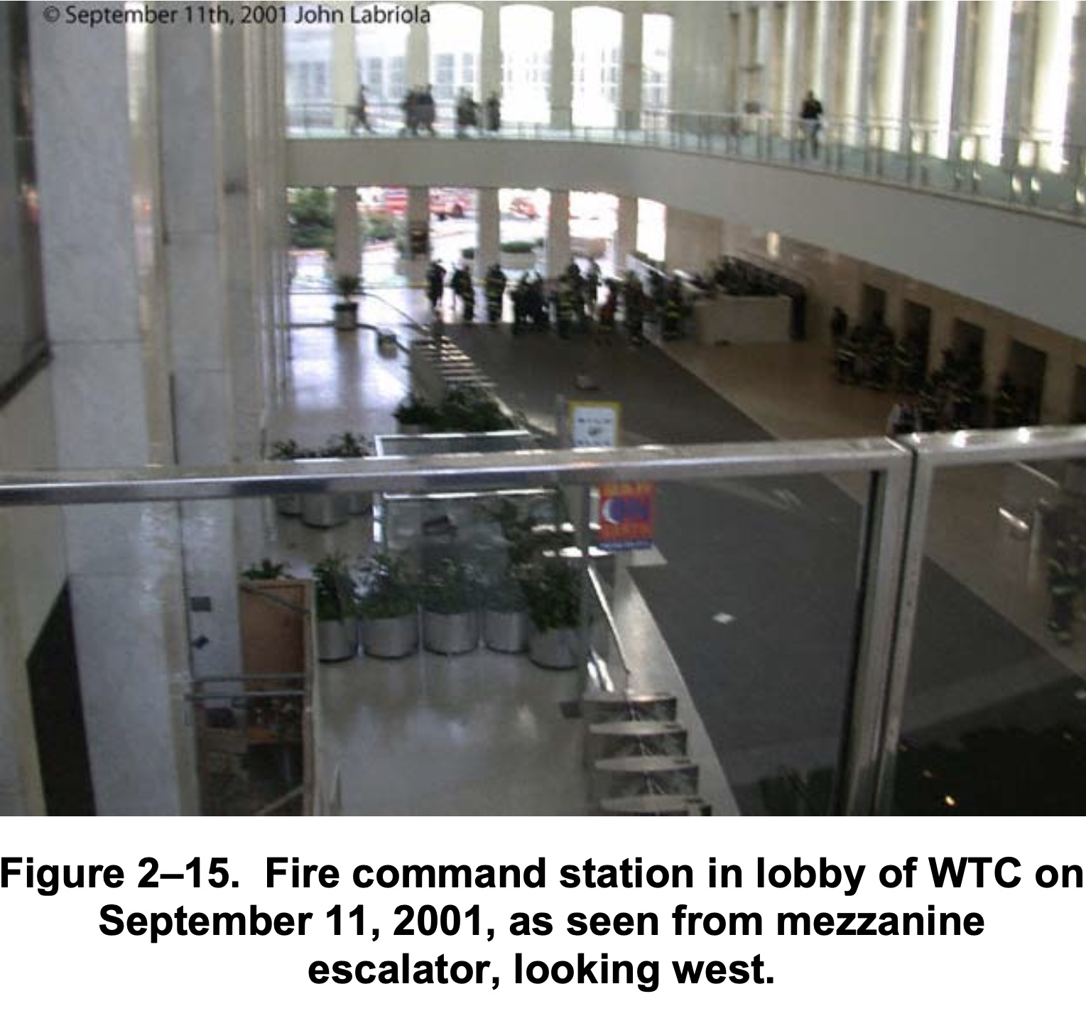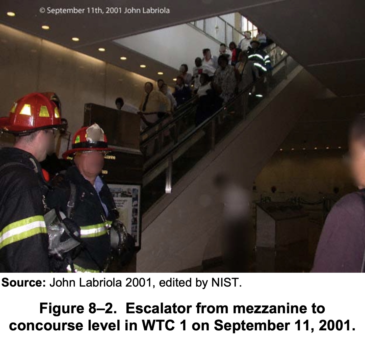 This figure from NCSTAR 1-7, which looks northwest inside the North Tower lobby, shows the escalator from the mezzanine, which is at the top, down to the concourse level, where the firemen are standing.