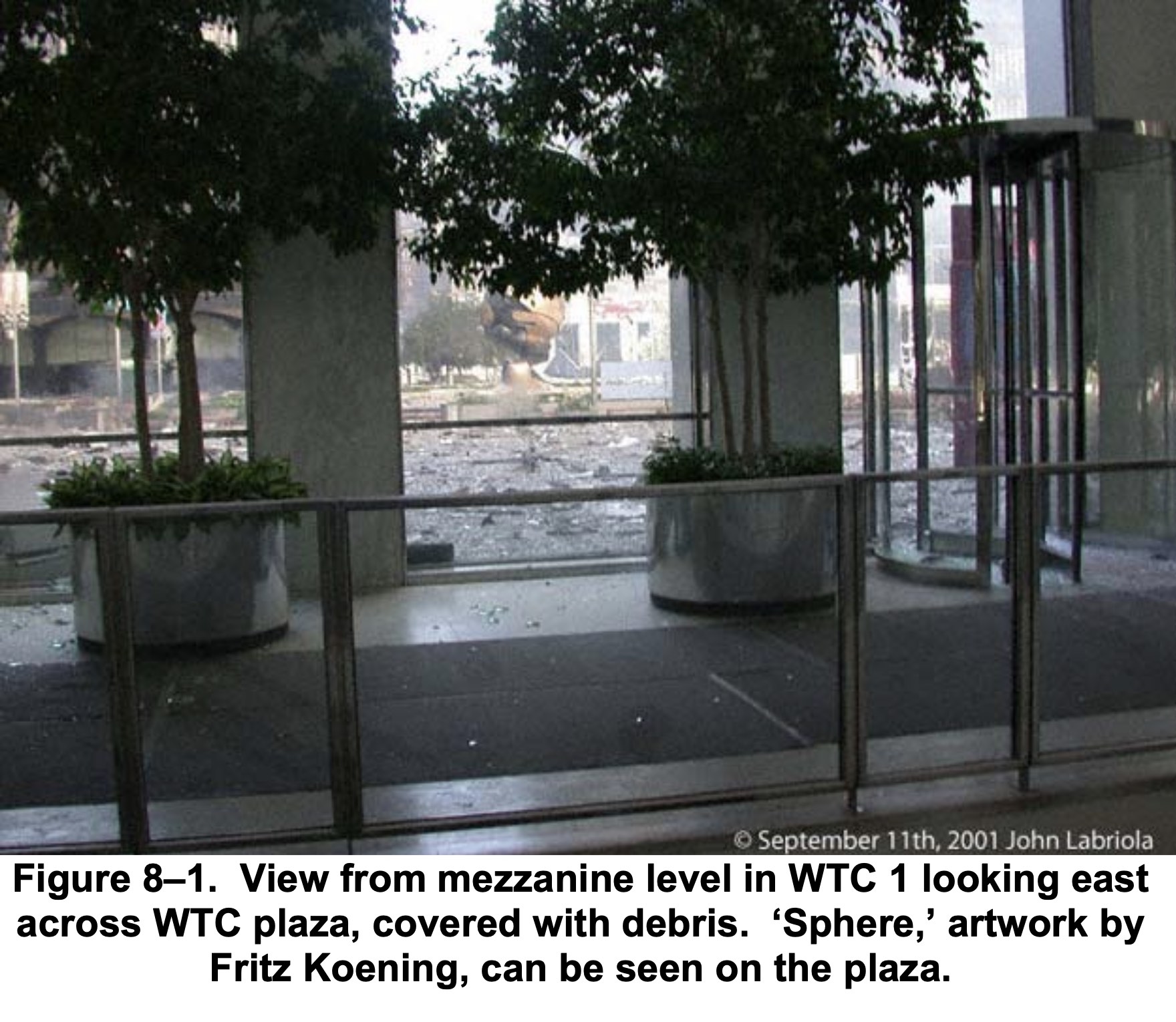 This figure from NCSTAR 1-7, looking from the east side of the North Tower lobby mezzanine, near the escalator, gives an eastward view of the debris-covered plaza.