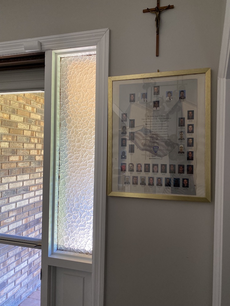 Portraits of the 37 fallen members of the Port Authority Police Department, which Sue Keane framed and hung next to her front door.