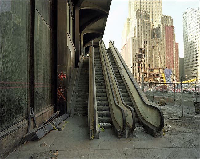 “We went into Building Five, and another firefighter was hollering, ‘We can get out this way!’ Building Five had an escalator that went down to Vesey Street. We were standing at the top of this escalator, and I saw some guys from the Emergency Services Unit down at the bottom. They were helping a very heavy woman we had gotten out of the stairwell about an hour before. I thought, Jesus Christ. I saw her two explosions ago. . . .