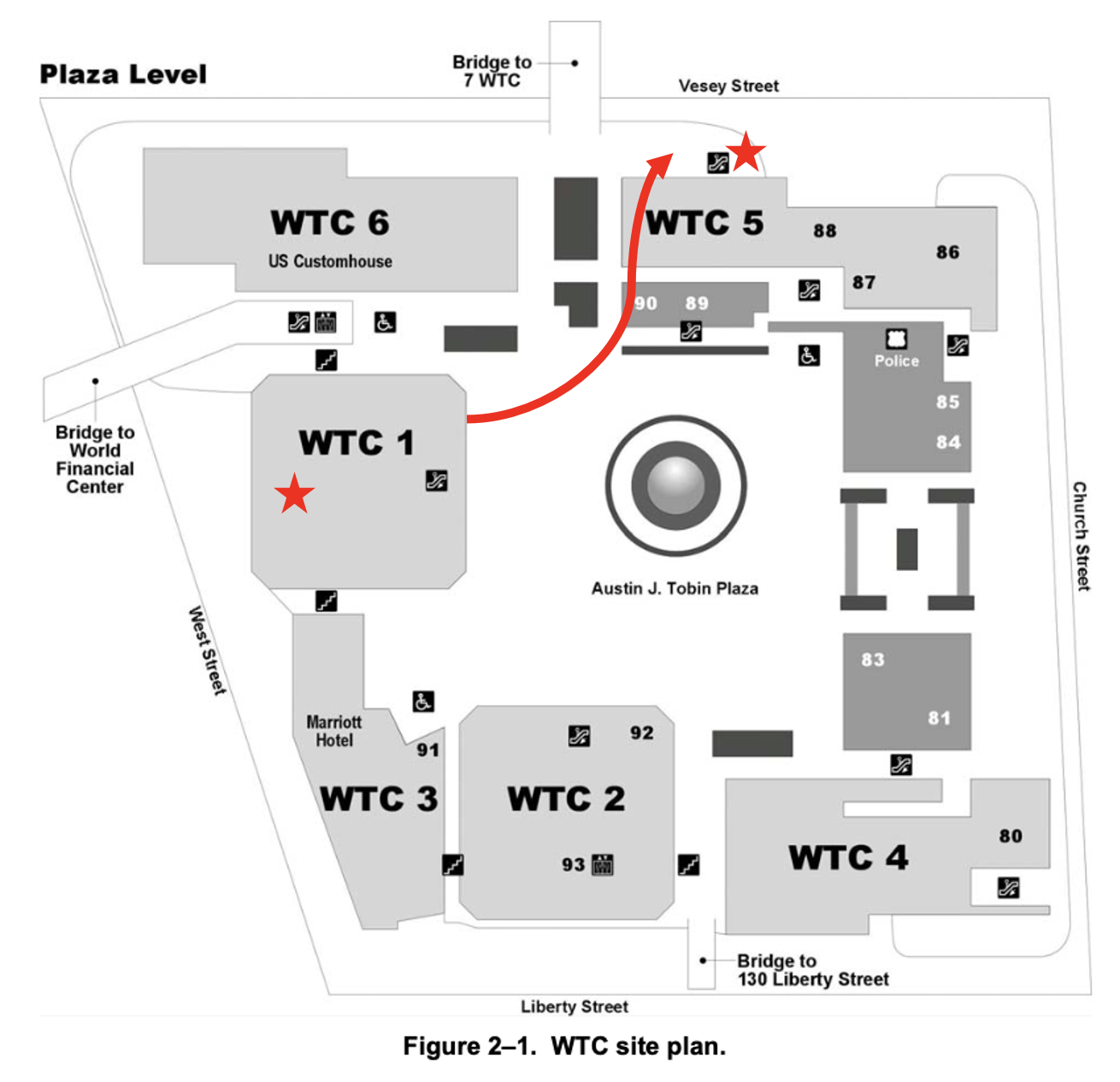 This figure from NCSTAR 1-7 of the NIST report provides a map view of the WTC complex. The star inside WTC 1 denotes Sue’s location at the time of the South Tower’s destruction at 9:59 AM. The red line approximates her escape route from the North Tower to WTC 5. The star at the top, next to WTC 5, denotes her location at the time of the North Tower’s destruction at 10:28 AM.