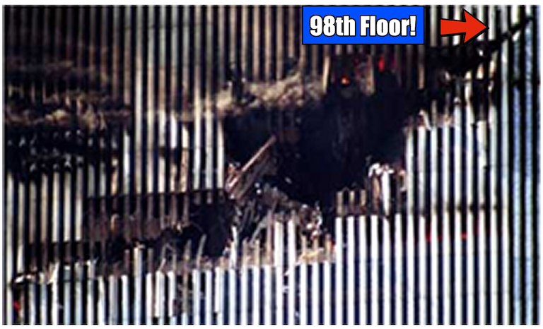 What should first jump out to the casual observer looking at the photo above is that the damage from the airplane impact occurred mostly from the 93rd to 97th floors, with only the tip of the airplane’s wing touching the 98th floor.
