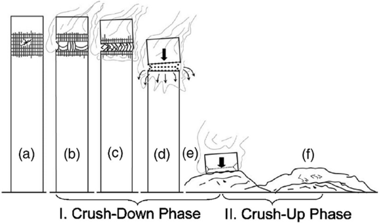 NIST then notoriously stops its analysis at collapse initiation and instead cites the theory advanced by Northwestern University engineering professor Zdeněk Bažant, who claims that, as those floors came down, they acted as a piledriver, crushing the floors below all the way to ground before also destroying themselves in the final “crush up” phase of their collapses. (Bažant needed an explanation for why there were no large top blocks sitting on the debris at Ground Zero, so he came up with the logic-defying crush-up phase.)