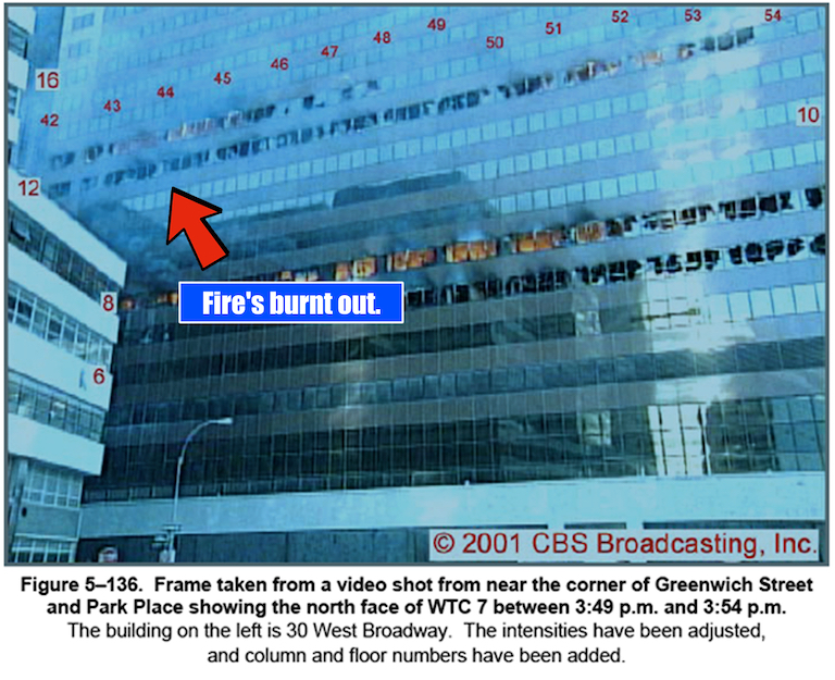 - Burnt-out fires: The fires in the northeast corner of the 12th floor of WTC 7 had burnt out more than an hour before the collapse occurred. NIST’s collapse scenario requires the fires to have been present at the time of the initiating local failure.
