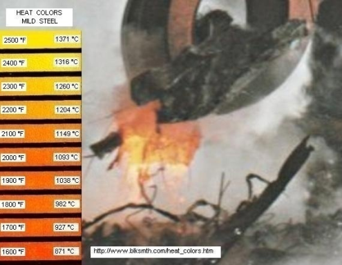 Second, we have already seen that there were metals that were either melted or evaporated at temperatures well above the melting point of steel and iron. Third, even if the crane photo did show molten glass, it would still need to have been heated to extremely high temperatures, since glass does not begin to give off any visible light until it approaches temperatures of 2240 ºF.15