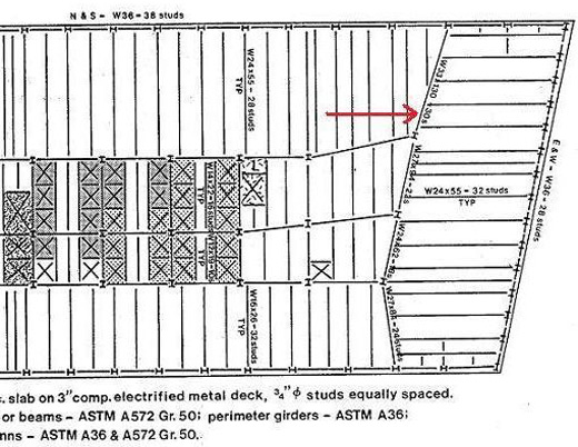 “Most of the beams [the words “and girders” are deleted] acted compositely with the slabs through the use of shear studs. Typically, the shear studs were 0.75 in. in diameter by 5 in. long, spaced roughly 1 to 2 ft on center. Studs were not indicated on the design drawings for [the words “many of the core” are deleted] the girders, i.e., composite action did not develop between the girders and the slab.” — NIST August 2008 Draft Report, NCSTAR 1-9, Vol. 1, page 15 [PDF page 59]