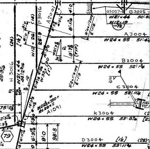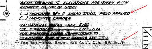 The erection drawings in the NIST final report show field-installed studs on the beams but not the girder between columns 44 and 79. A note on the drawing says, “For additional studs see cust. dwg. S8,” but the corresponding note has been erased.