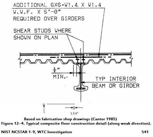 NOTE: NIST changed the wording of this section in the three months between its August 2008 draft report (see sentence directly above this note) and its November 2008 final report, which it newly worded this way: “Most of the beams acted compositely with the slabs through the use of shear studs. Typically, the shear studs were 0.75 in. in diameter by 5 in. long, spaced roughly 1 ft to 2 ft on center. The number of studs on a floor beam was indicated on the design drawings. Photographic records showing the demolition of a floor slab (tenant renovation) on the south side of a typical tenant floor confirms the number of studs shown on the drawings. Studs were not indicated on the design drawings for the girders, i.e., composite action did not develop between the girders and the slab.” — NIST November 2008 Final Report, NCSTAR 1-9, Vol. 1, page 15 [PDF page 59]