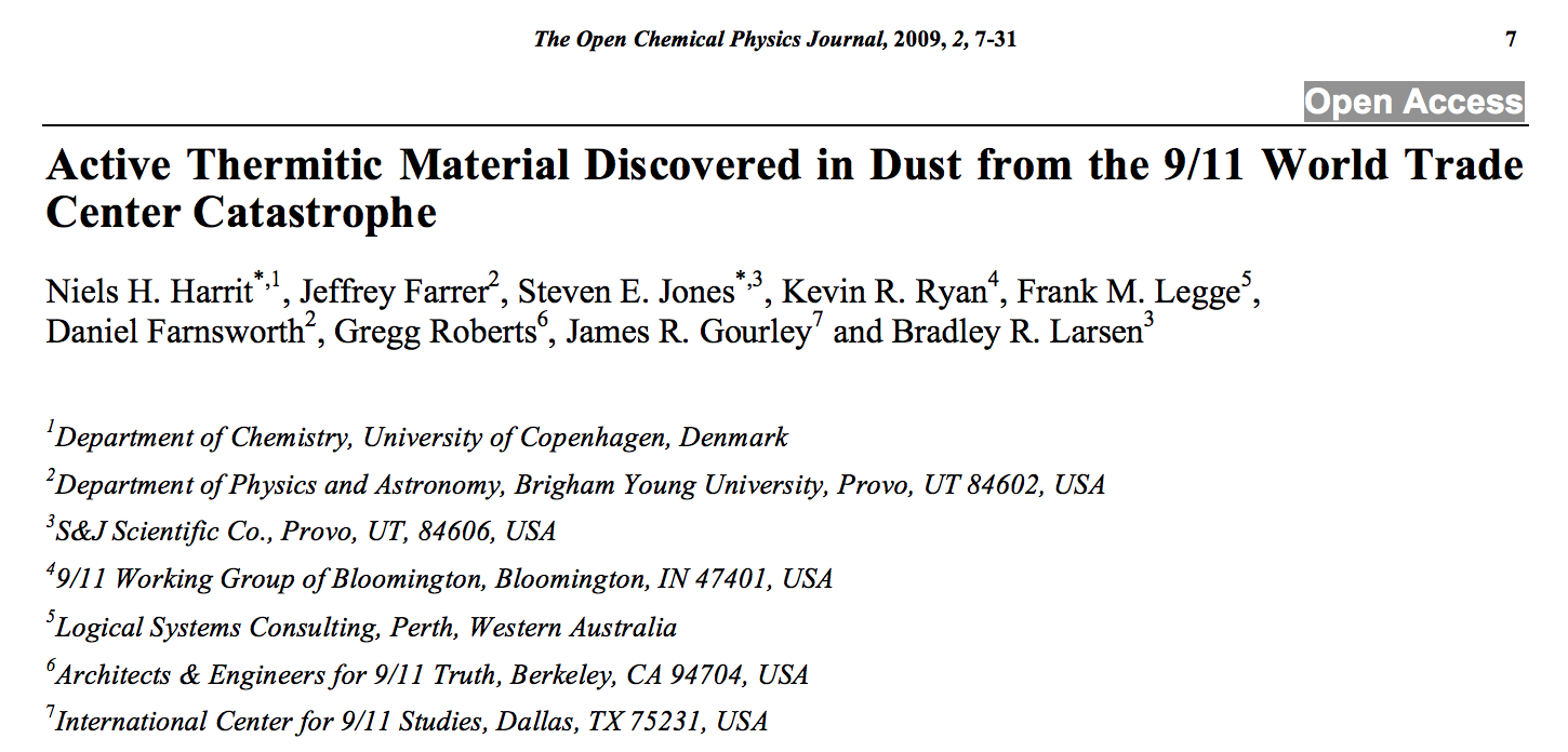 Abstract: We have discovered distinctive red/gray chips in all the samples we have studied of the dust produced by the destruction of the World Trade Center. Examination of four of these samples, collected from separate sites, is reported in this paper. These red/gray chips show marked similarities in all four samples. One sample was collected by a Manhattan resident about ten minutes after the collapse of the second WTC Tower, two the next day, and a fourth about a week later. The properties of these chips were analyzed using optical microscopy, scanning electron microscopy (SEM), X-ray energy dispersive spectroscopy (XEDS), and differential scanning calorimetry (DSC). The red material contains grains approximately 100 nm across which are largely iron oxide, while aluminum is contained in tiny plate-like structures. Separation of components using methyl ethyl ketone demonstrated that elemental aluminum is present. The iron oxide and aluminum are intimately mixed in the red material. When ignited in a DSC device the chips exhibit large but narrow exotherms occurring at approximately 430 ˚C, far below the normal ignition temperature for conventional thermite. Numerous iron-rich spheres are clearly observed in the residue following the ignition of these peculiar red/gray chips. The red portion of these chips is found to be an unreacted thermitic material and highly energetic.