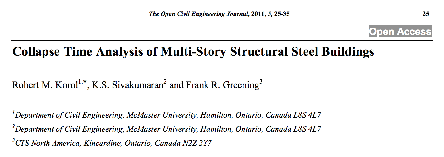 Abstract: Until recently, the progression and time of collapse of structures has not been a primary objective of the structural engineering profession. However, such events are likely to be of major interest in high rise building situations where a fire-initiated failure takes place, or where a controlled demolition is to be implemented. The paper attempts to shed light on this problem and to develop velocity profiles during a collapse event, also potentially important, especially in built-up areas. Because of the complex nature of both the structural system and the process of collapse, analysis methods need to be simplistic, which are yet realistic and are easily understood by designers and code writers of the nature and cause of a building collapse. The objective of this paper is to shed light on this problem by employing the most basic equations of Newton’s laws of motion. A formulation of the problem of a building frame of N stories, subjected only to gravity loading is postulated that involves an analysis employing a generic one-dimensional discrete model of progressive collapse. The supporting elements within its nth story are suddenly degraded by whatever cause, with the velocity and time steps calculated. Several design scenarios are presented for the columns with prescribed energy dissipation properties ascertained at any level, thus allowing the motion to be determined in accordance with the known equations of energy and momentum. An example 10-story structure is proposed to illustrate the method, in which the column designs, utilizing square hollow sections and W-shapes, are governed by a combination of dead, live and wind loads. For the 6 designs postulated involving tubular columns alone, and with sequential removal of columns in each of the 10 stories, it was found that progressive collapse was arrested in 90% for such hypothetical scenarios. For the other 10%, global collapse times exceeded that of free-fall by 57 to 228%.