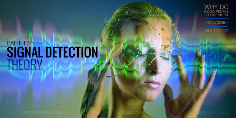 We continue Ms. Shure's analysis with "Part 12: Signal Detection Theory," which reports on whether or not people perceive information amid external and internal distractions, and how this perception may effect their receptivity to the educational efforts of 9/11 skeptics.