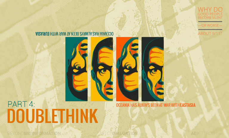 Though the term doublethink is not included in today’s official psychological vocabulary, perhaps it should be, given that it’s such a common defense mechanism. Regardless, the concept of doublethink has established itself in our culture, since it aptly — even humorously — describes the capacity of the human mind to readily adapt to any official pronouncement on any subject, such as 9/11, while at the same time being fully aware of evidence that contradicts those official pronouncements!