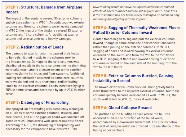 Below we focus on NIST’s failed attempts to prove three links in that chain: Fireproofing Dislodgment, Heating of Structural Members, and Collapse Initiation and Progression.