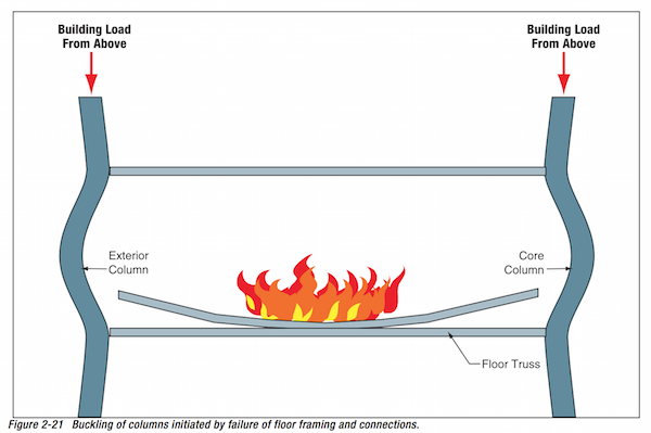 Figure 2-21 from the FEMA report depicts a failed floor truss falling on the floor below it and the buckling of columns that were previously receiving lateral support from that floor truss.