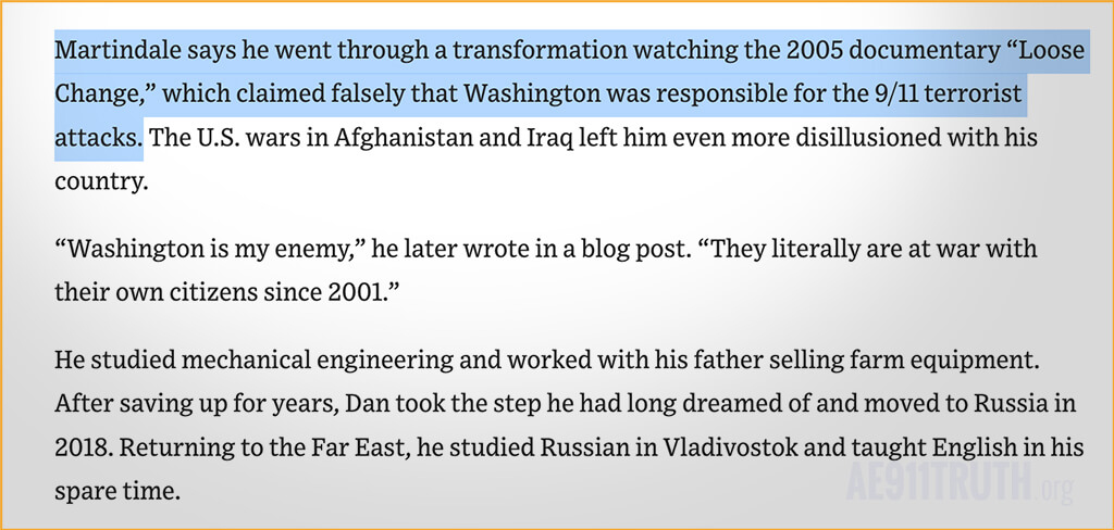 The WSJ article then attempts to connect disloyalty to the United States to questioning the 9/11 official story. The authors write that Martindale describes going through a “transformation” after watching the 2005 documentary Loose Change, which, according to the article, “claimed falsely that Washington was responsible for the 9/11 terrorist attacks.”