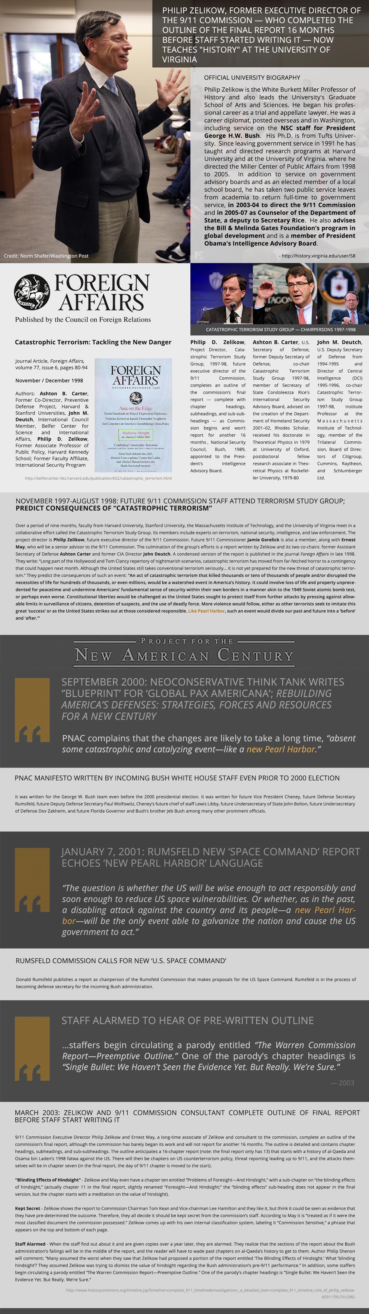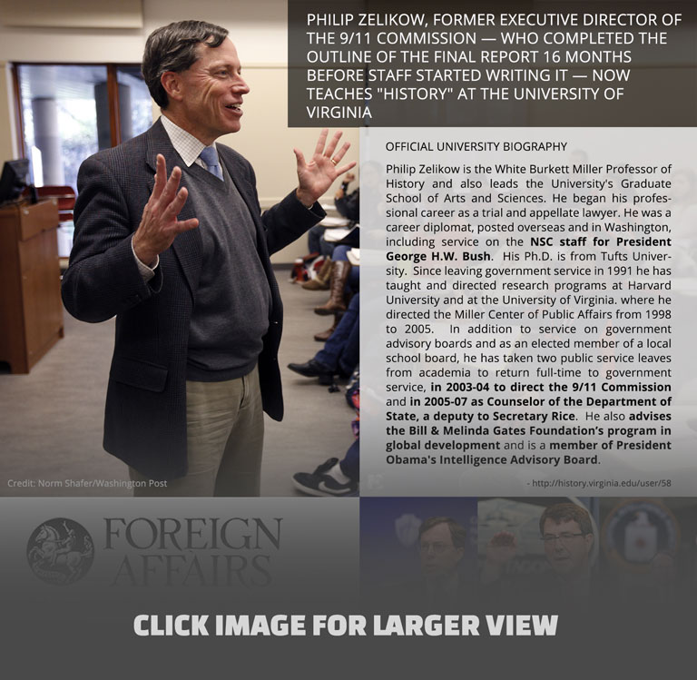 One professor who teaches neither architecture nor engineering was included in the outreach effort. Steele and the donor realized that Philip Zelikow, who was executive director of the 9/11 Commission and who now teaches history at the University of Virginia, "might be interested in peering through some of the holes that the Commission left in its much-criticized final narrative."