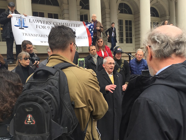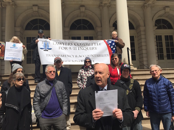 David Meiswinkle, Esq., of the Lawyers’ Committee for 9/11 Inquiry, at a press conference on the steps of New York City Hall, holds the petition just filed with the U.S. Attorney for the Southern District of New York.