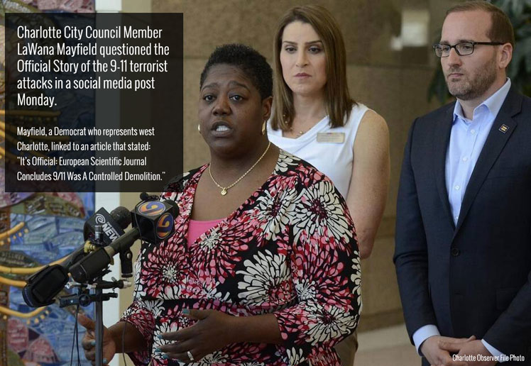 We, whose loved ones were killed in the events of September 11, 2001, hereby express our appreciation for Charlotte Councilwoman LaWana Mayfield bringing attention to the unanswered questions surrounding the destruction of World Trade Center Buildings 1, 2, and 7.