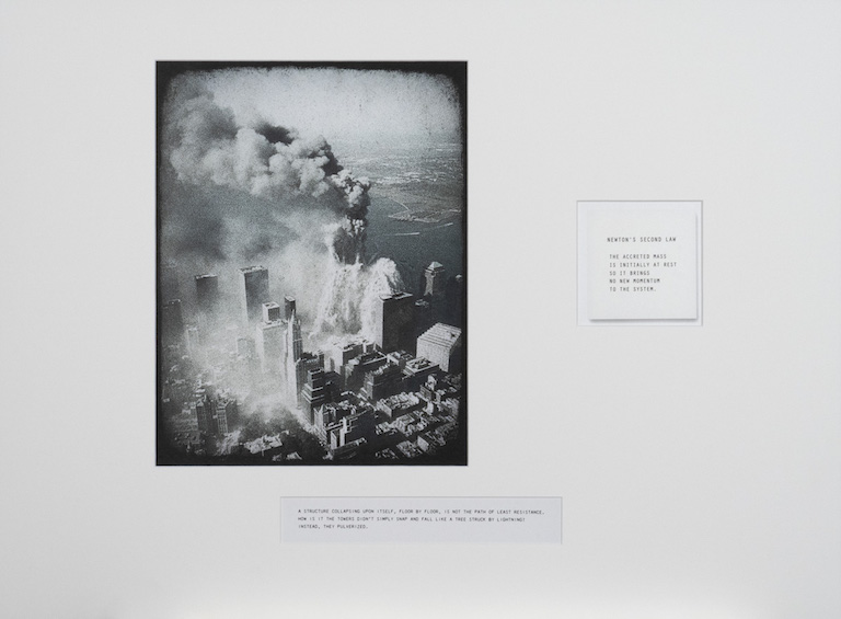 “A structure collapsing upon itself, floor by floor, is not the path of least resistance. How is it the towers didn’t simply snap and fall like a tree struck by lightening? Instead, they pulverized.” Support for Riskin’s claims can be found in 9/11: Explosive Evidence — Experts Speak Out, World Trade Center Twin Towers, Part 3 and Part 5, and in several peer-reviewed papers, including “Some Misunderstandings Related to WTC Collapse Analysis” in the International Journal of Protective Structures. (Fredric Riskin, 9/11 The Collapse of Conscience, 20" X 27”, Panel 23 of 43, Printed on kozo-backed Gampi using pigment inks. Courtesy the artist and Ronald Feldman Gallery, NY.)