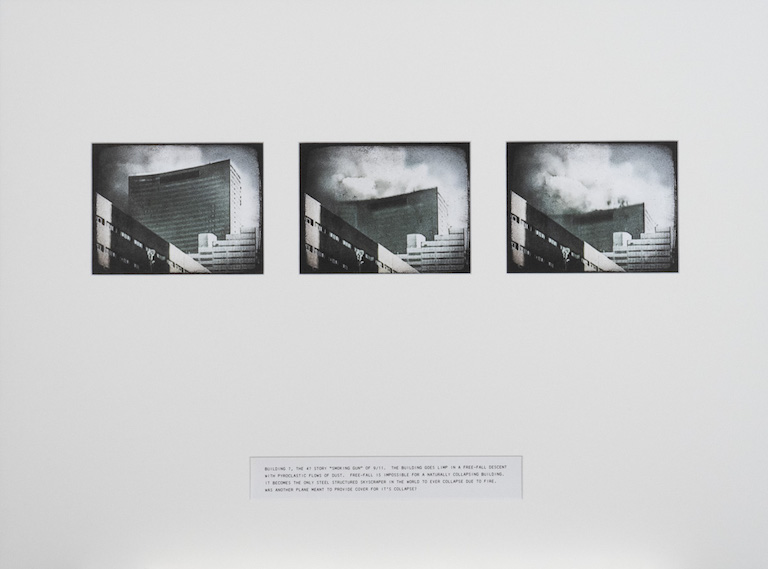 “Building 7 . . . goes limp in a free-fall descent with pyroclastic flows of dust. Free-fall is impossible for a naturally collapsing building. It becomes the only steel structured skyscraper in the world to ever collapse due to fire.” Support for Riskin’s claims, most of which are undisputed factual observations, can be found in 9/11: Explosive Evidence — Experts Speak Out, World Trade Center 7, Part 5, and in several peer-reviewed papers, including “The collapse of WTC 7: A re-examination of the ‘simple analysis’ approach” in the Challenge Journal of Structural Mechanics. (Fredric Riskin, 9/11 The Collapse of Conscience, 20" X 27”, Panel 24 of 43, Printed on kozo-backed Gampi using pigment inks. Courtesy the artist and Ronald Feldman Gallery, NY.)