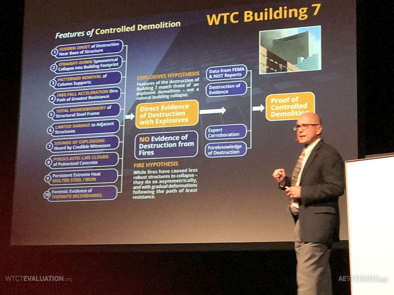 After Gage finished cataloguing all the signs pointing to explosives and incendiaries having been planted in all three buildings, the audience seemed stunned by the overwhelming quantity and irrefutable nature of the evidence he laid out. They leveled some thoughtful questions at Gage: “Why would the perpetrators have done this?” and “How could they set up all those explosives?” were among the queries.