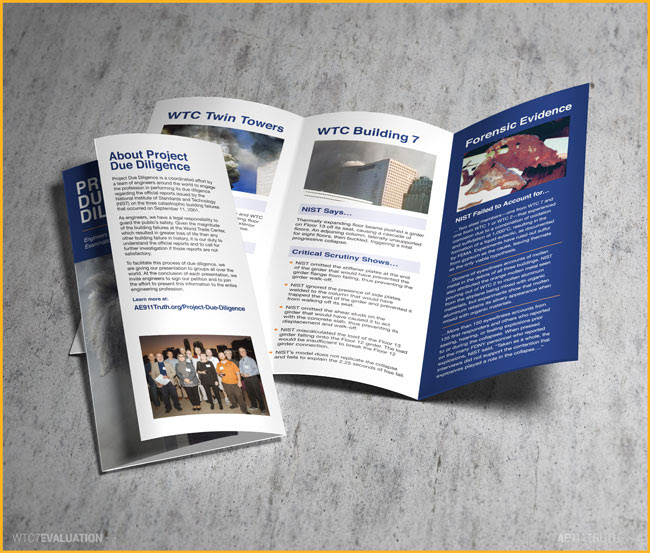 Plus, when you donate $20 or more, we will mail you five copies of our Project Due Diligence brochure to give out to engineers or architects or other colleagues whom you wish inform about the work of AE911Truth. Our goal is for 200 supporters to distribute a total of 1,000 Project Due Diligence brochures to your friends and colleagues — on top of the 1,000 we’ll be handing out next week in Orlando. (If you donate via Paypal, please include your mailing address so we can send you your brochures.)