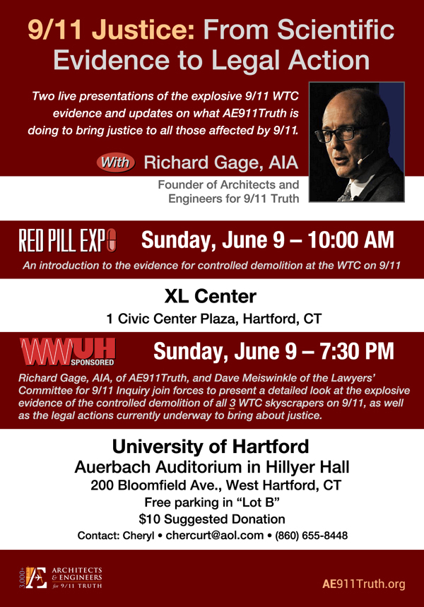 At the evening event, “9/11 Justice: From Scientific Evidence to Legal Action,” Gage will be joined by Dave Meiswinkle, president of the Lawyers’ Committee for 9/11 Inquiry, at the University of Hartford’s Auerbach Auditorium in Hillyer Hall.