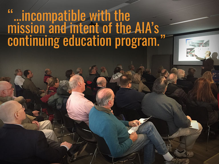According to the AIA’s managing director of professional development and resources, Stephen Martin, the AIA conducted a more recent review of our courses and, based on the results of that review as well as “past audit concerns,” determined that the “content of the courses and mission of [our] organization [were] incompatible with the mission and intent of the AIA’s continuing education program.” The AIA provided no explanation for its determination and did not respond when asked to provide the results of its review.