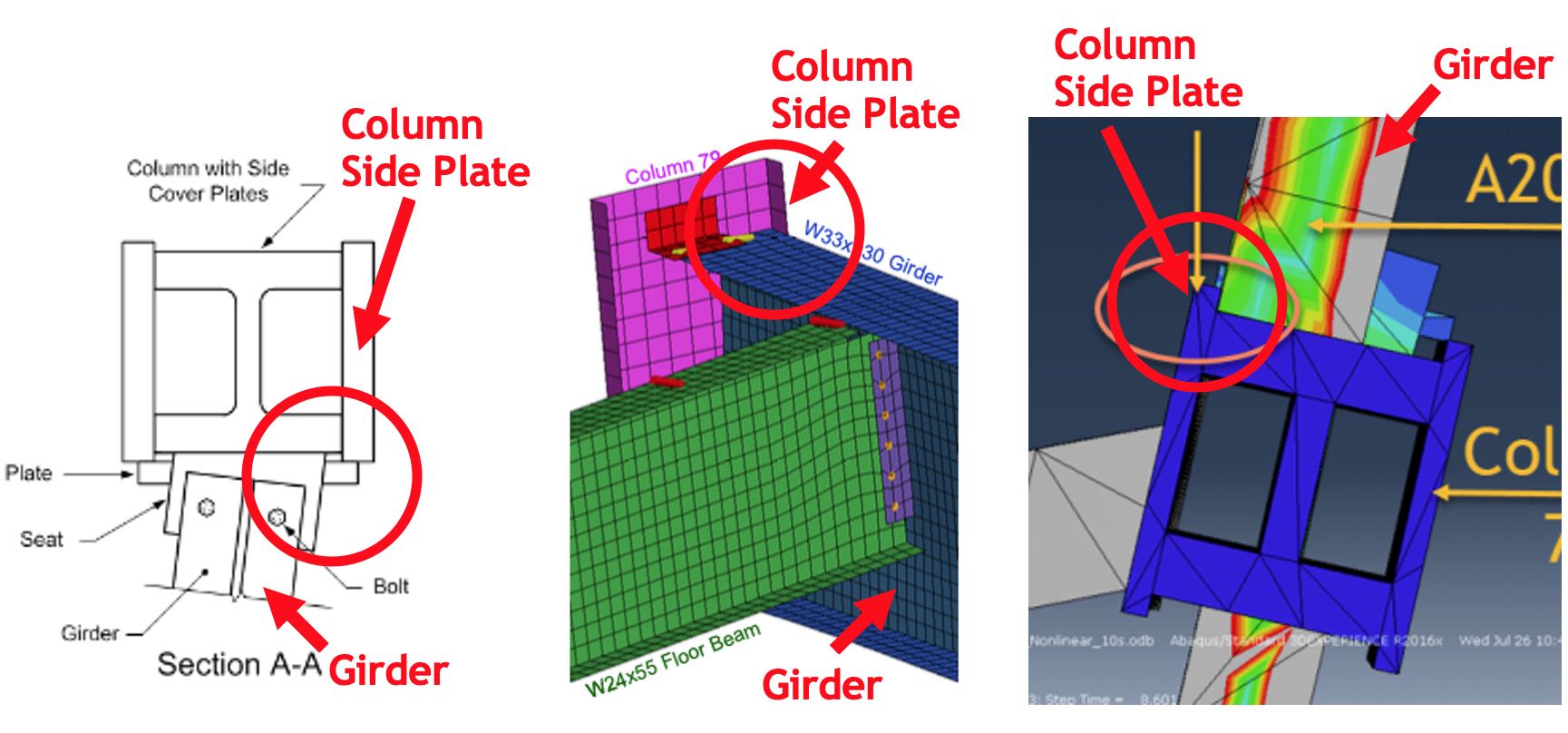 Left: The figure cited by NIST in its response — not drawn to scale — shows the position of the girder in relation to the column at room temperature. Center/Right: NIST and University of Alaska Fairbanks analysis figures both show the position of the girder in relation to the column at elevated temperatures, with the girder expanded and its edge trapped behind the side plate of the column. Red circles highlight the relationship between the edge of the girder and the column side plate.