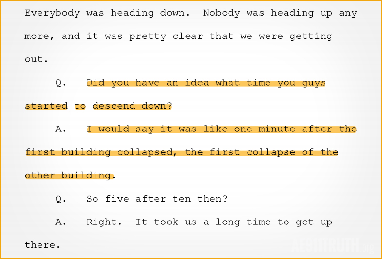 But this scenario is seriously problematic. First, it ignores clear statements from both men that they witnessed an explosion in the stairwell that destroyed the 6th floor landing. (Later, Hess changed his account to align with NIST’s, but Jennings maintained his version.) Second, this scenario requires that Jennings and Hess were only able to descend 17 floors in 29 minutes, an average of one minute and 42 seconds per floor. Given that Jennings described hurrying down the stairs — “instead of taking one step at a time, I’m jumping landings,” Jennings told the BBC — the timeline is simply not credible.