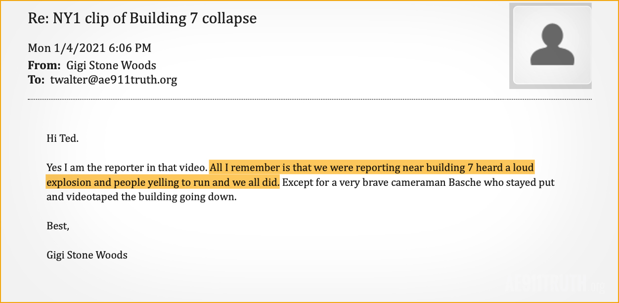 Walter then contacted Woods to ask her to confirm her statement of 19 years earlier, and that is just what she did in an email response on January 4, 2021. In her reply, she stated, “All I remember is that we were reporting near building 7 [sic] heard a loud explosion and people yelling to run and we all did.”