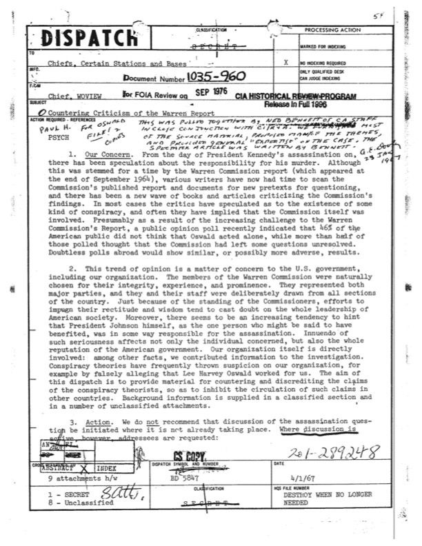 The CIA dispatch only became public in 1976 following a Freedom of Information Act request by the New York Times. On the dispatch were marked “PSYCH” (for psychological warfare) and “destroy when no longer needed.” The subject line read: “Countering Criticism of the Warren Report.”