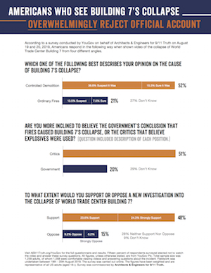 A solid majority of Americans who watch the Sept. 11, 2001, collapse of World Trade Center Building 7 on video don’t buy the government’s story that fires brought it down, according to a new survey conducted by YouGov on behalf of Architects & Engineers for 9/11 Truth (AE911Truth).